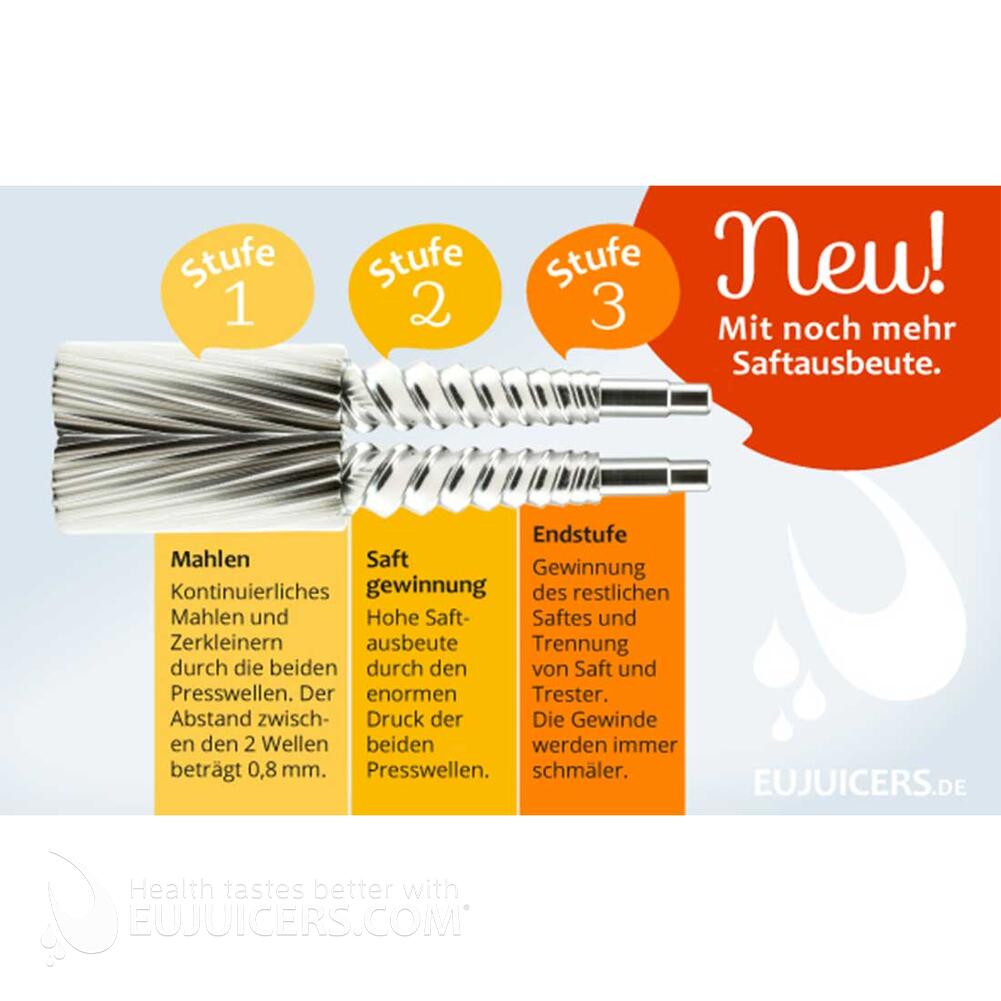 - Entsaftertyp: horizontaler Slow Juicer mit Zwillings-Presswalzen (Twin Gear Juicer)