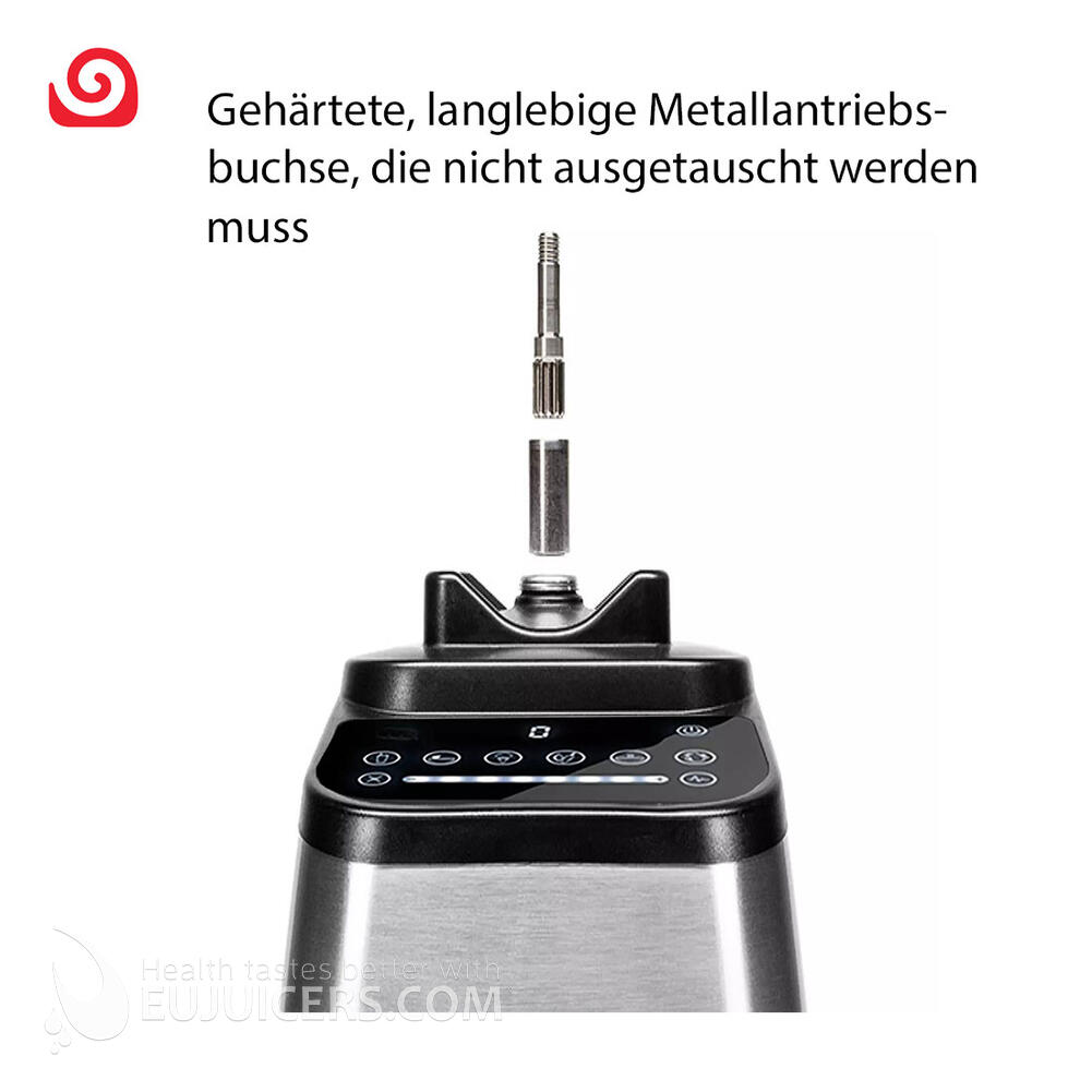 Andere Mixer verwenden Kunststoff-Antriebsbuchsen, die (im unglücklichsten Fall) unter Druck brechen und einen Austausch erfordern könnten. Die Blendtec-Antriebssockel aus gehärtetem Metall sind jedoch die stärksten in der Branche. Sie müssen nie ausgetauscht werden und sind daher langlebig und minimieren Ausfallszeiten.