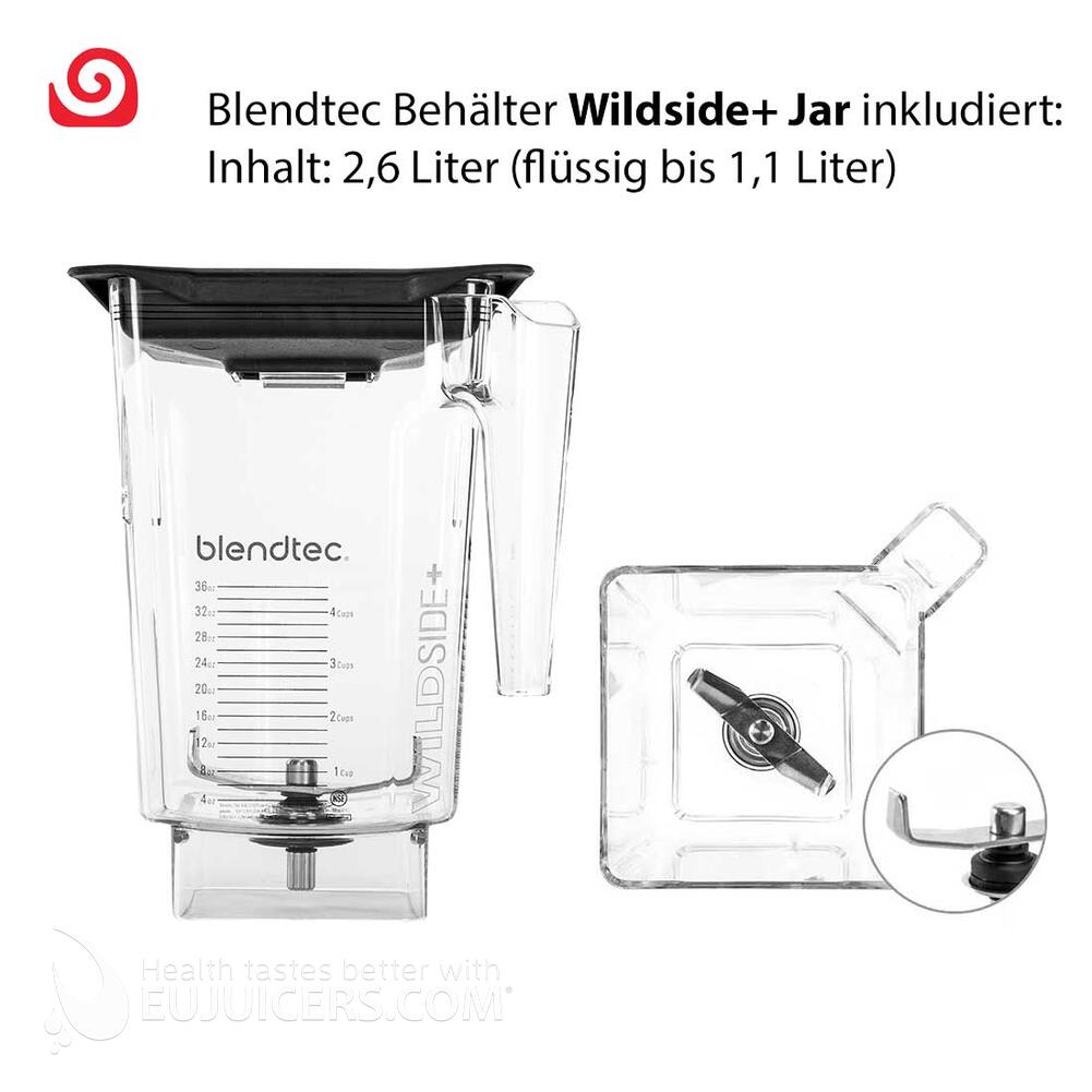 - Blendtec Wildside+ Jahr 2,6 Liter (beim Blendtec 625 bereits inkludiert!): ideal für große Mengen an Mixgut, jede Art von Smoothies, gefrorenes Mixgut, Mehl, Brotteige und dickflüssige Massen