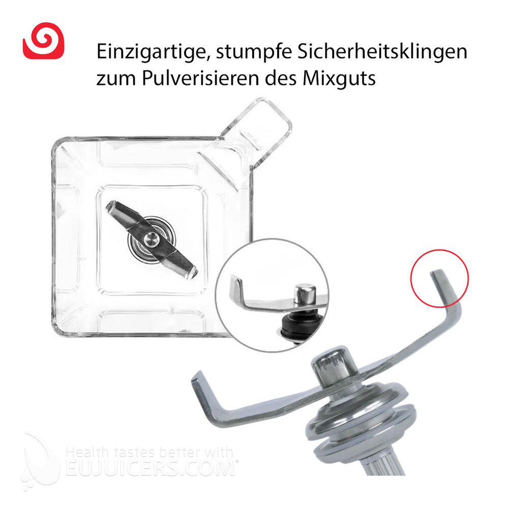 Normalerweise sind die Messer bei Hochleistungsmixern sehr scharf und dünn und daher mit großer Vorsicht zu handhaben und zu reinigen. Blendtec hat einzigartige, stumpfe Sicherheitsklingen, die absolut sicher in der Verwendung und Reinigung sind. Sie bestehen aus kaltgepresstem Stahl und sind bis zu 80% dicker und 10-mal stärker als die Klingen anderer Hersteller. Anstatt zu schneiden, pulverisieren und zerschlagen sie Zutaten zu einer seidig, glatten Konsistenz.