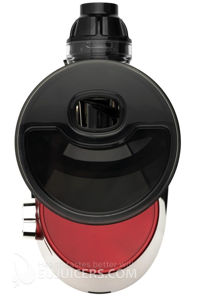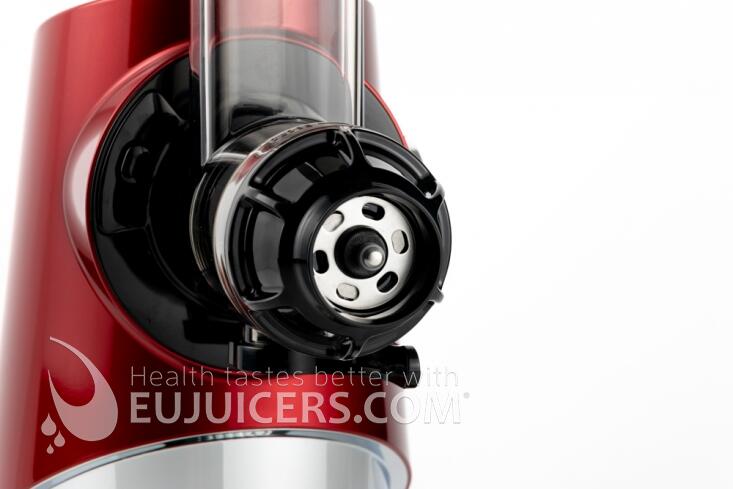 Beim Einfülltrichter wurden die bewährten Ideen der vertikalen Sana-Entsafter übernommen und für die Sana 727 Supreme angepasst. Das Resultat ist ein Doppelbehälter mit einer Standardöffnung und einer tiefen Schüssel für die einfache Befüllung kleinerer Lebensmittel (z.B. Trauben) oder Blattgemüse.